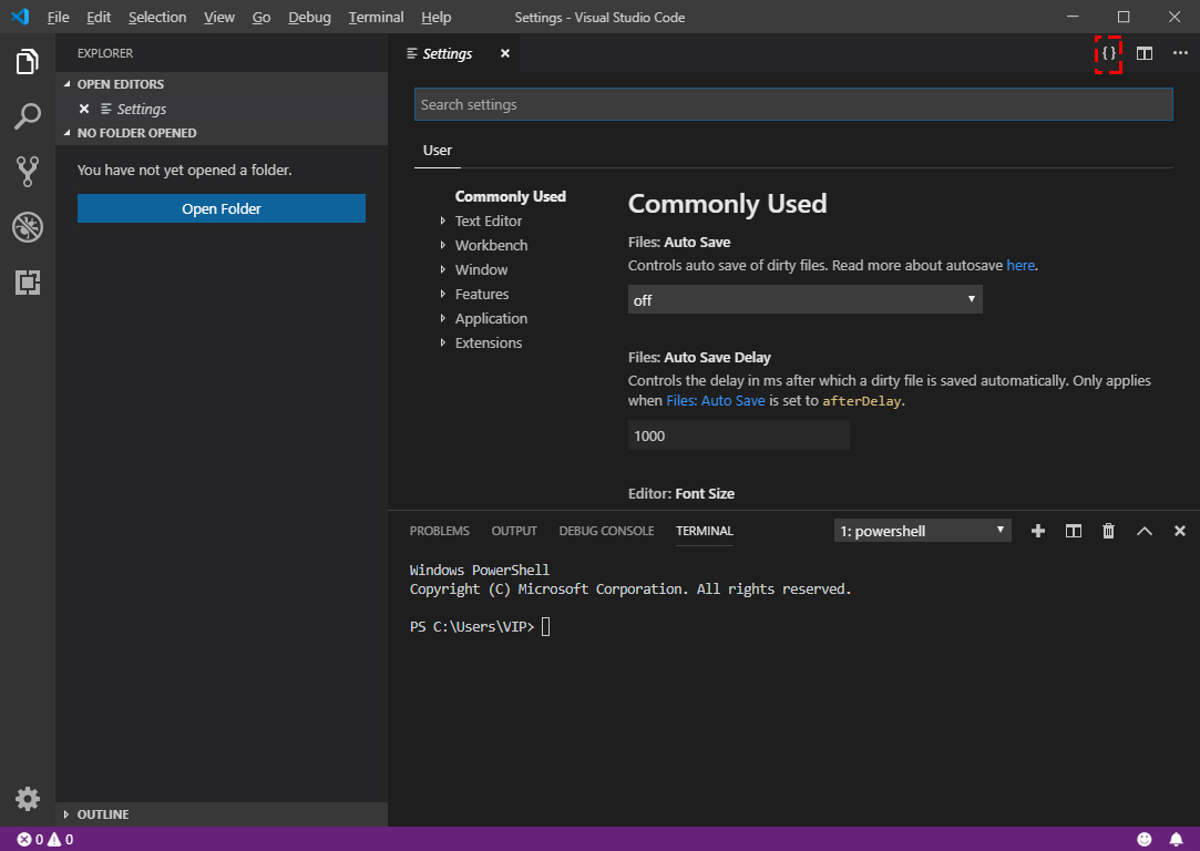 2. settings.json 파일 열고 내용 기입.  settings.json으로 들어가서 소스를 추가 해줘야 합니다.settings.json은 화면 오른쪽 상단 중괄호를 누르면 나옵니다.