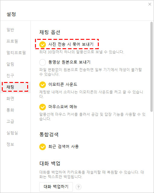 PC 카카오톡에서 사진을 보낼때 묶어 보내는 옵션을 확인할 수 없어서
