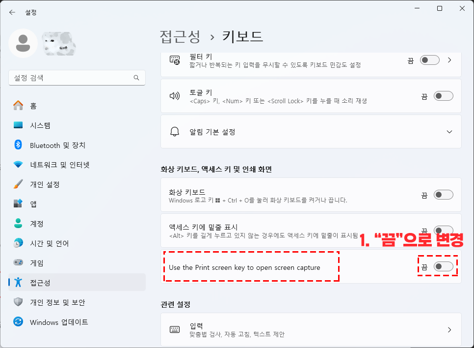 프린트 스크린 누를때 "캡처 도구" 나오는 기능 끔으로 변경