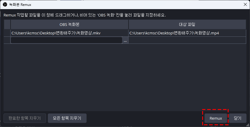 위와같은 화면이 나오고 Remux 버튼을 누르면 변환을 시작합니다.