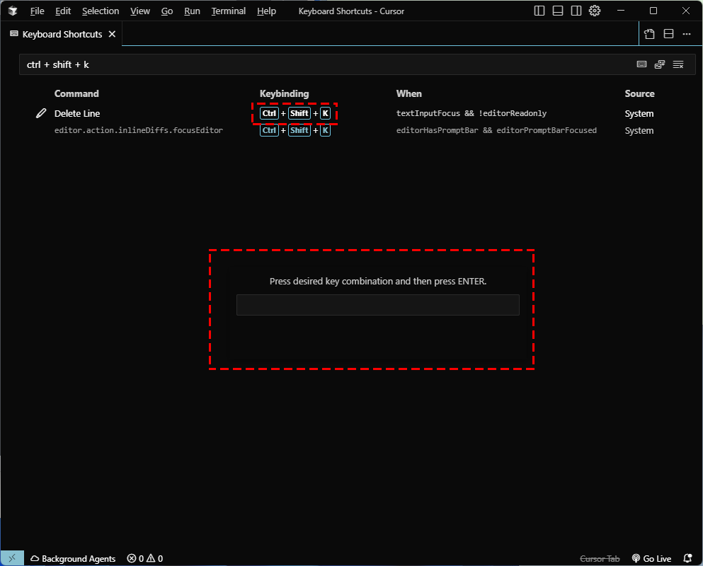 기본적으로 vscode와 연동 되지만 기존에 cursor에 설정과 중복되면서 작동하지 않으니 단축키 한번 확인후 cursor에서 재설정 해준다. |