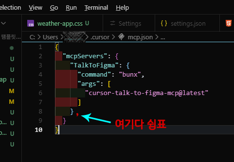 아까 내용을 붙여 넣어주시면 이렇게 나올꺼예요. 참고로 피그마 MCP 내용은 TalkToFigma 영역 부터 감싸고 있는 부분까지가 필요한 내용이예요.
