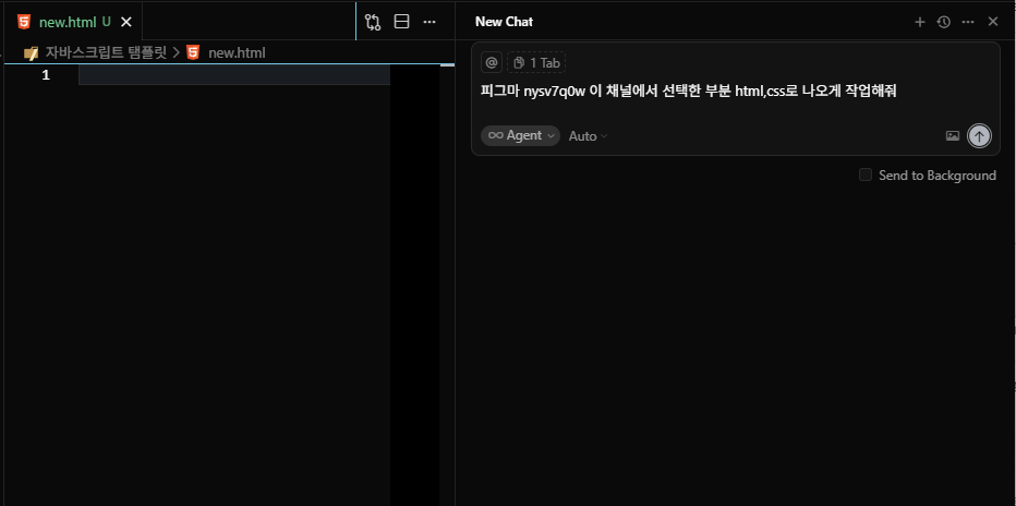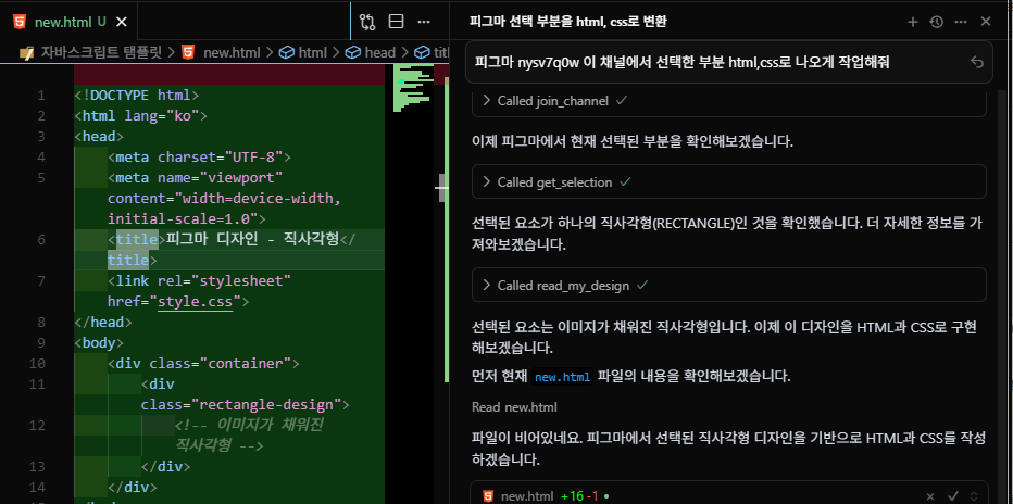 아까 확인했던 화면에서 빨간 영역있죠 이 부분이 피그마 채널이라고 하는 부분입니다. 저 안의 내용은 어딜 선택하냐에 따라 바뀔수 있습니다. 저 채널명을 통해 cursor에서 html,css 로 디자인을 만들수 있고 또한 cursor에서 피그마에게 디자인을 요청할 수도 있어요.